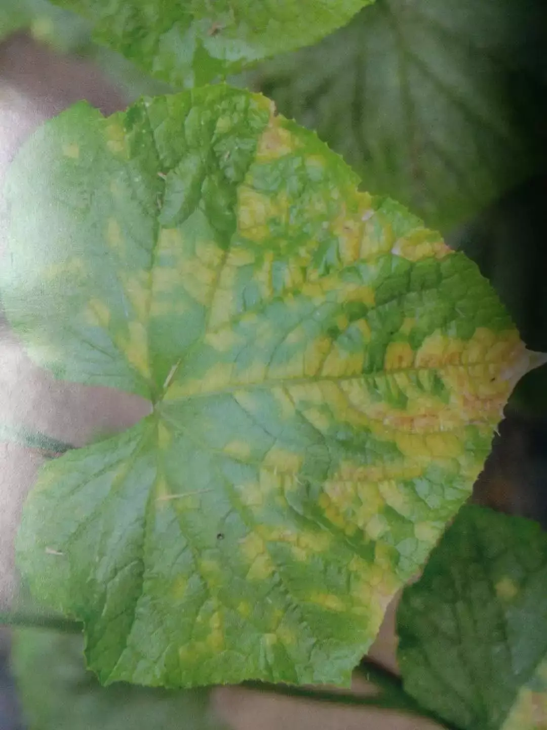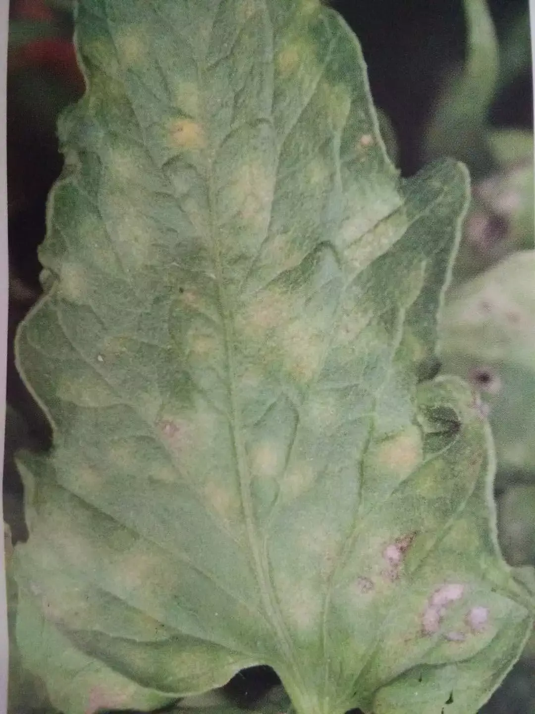 叶片正面形成不规则或椭圆形淡黄色褪绿斑,边缘不明显。