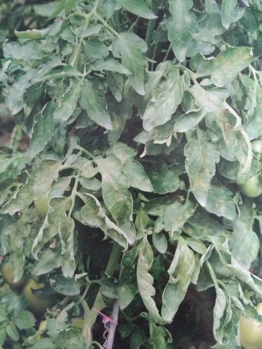 叶背面出现灰白色至黑褐色霉层,后期变成紫灰色或深灰色至黑色或黄褐色,严重时叶片干枯、卷曲。
