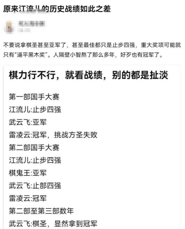 根据网友扒出的历史战绩,江流儿的荣誉平平无奇。第一次国手大赛他进不了决赛,第二次国手大赛他还是停留在四强。《新围棋少年》的棋圣是武云飞,江流儿还是拿不到冠军。江流儿的历史成绩是两次四强,一次名次不明,总体而言和棋圣不沾边。而且更离谱的是棋鬼王第一次参赛就杀进决赛勇夺亚军,超过江流儿历史最佳成绩。