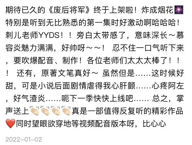 另外制作组的用心监制,配音演员的细致演绎,在听众里也被看到,被称赞。