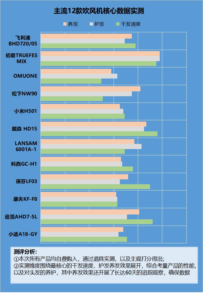 文章到这里已经非常详细地跟大家科普了,关于长期使用吹风机的危害,当然这是基于长期使用非专业吹风机才会对头皮、发质产生损害,而使用专业的养发型吹风机的好处也与大家普及了。现如今市面上大多吹风机商家都在虚假宣传自己的产品具备养发功能。实际上,盲目的参数堆砌不能称得上专业,缺少核心技术调校的产品,护发效果又能好到哪里去呢?那么在琳琅满目的产品中,如何挑选真正优质的专业养发吹风机?大家可以参考由专业调研机构制作的全网十大吹风机综合性能评分图,大众选出的产品,真实的数据无疑会更有说服力。
