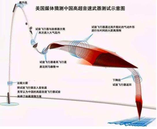 通常,一个物体抛起来再落下,轨迹是个抛物线,大多数导弹的路径也是这样,但钱学森弹道利用了高层大气的“弹性”,获得了一种打水漂似地路径。东风17发射后会以很高的角度快速冲出大气层,在重新返回大气层时会以很低的角度斜擦大气层的“顶面”。就像贴着水面擦过的光滑石子被水面弹起来,导弹强烈挤压下方的大气,也一样会被大气弹起来,并且在这个过程中保持极高的速度。