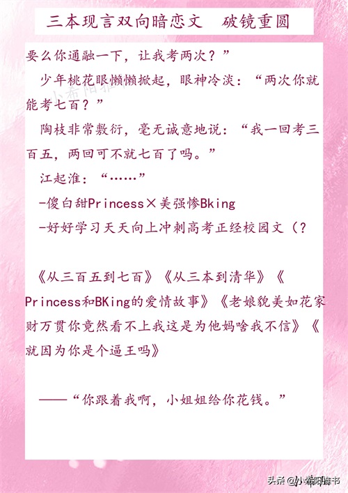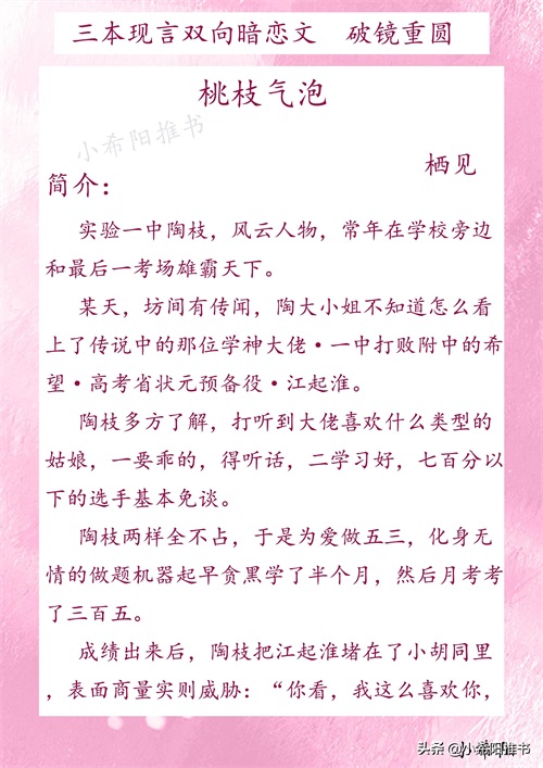 简要概括:这本就是校园文,不良少女从成绩渣渣到后来的逆袭,只是因为一人,那个时刻牵动身心的人,女主拼了命的想走到男主身边,后情节走两人久别重逢的团聚甜甜系列。