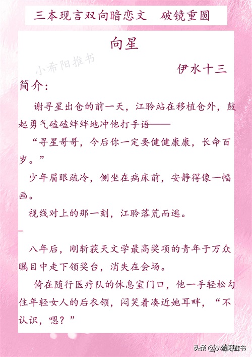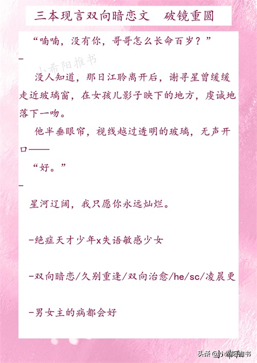 第二本属于双向救赎吧,女主出车祸后失语,在医院认识白血病的少年,少年孤独又可怜,女主主动靠近,一步步帮助男主重拾希望,男主帮助女主补习功课,两人早已成为彼此的光,后来男主手术前失去联系,女主误会男主抛弃了她。八年后两人再次相遇,男主当年只为拯救破碎的身体,不敢靠近女主,事业有成,身体完好,才敢来找自己的女孩。