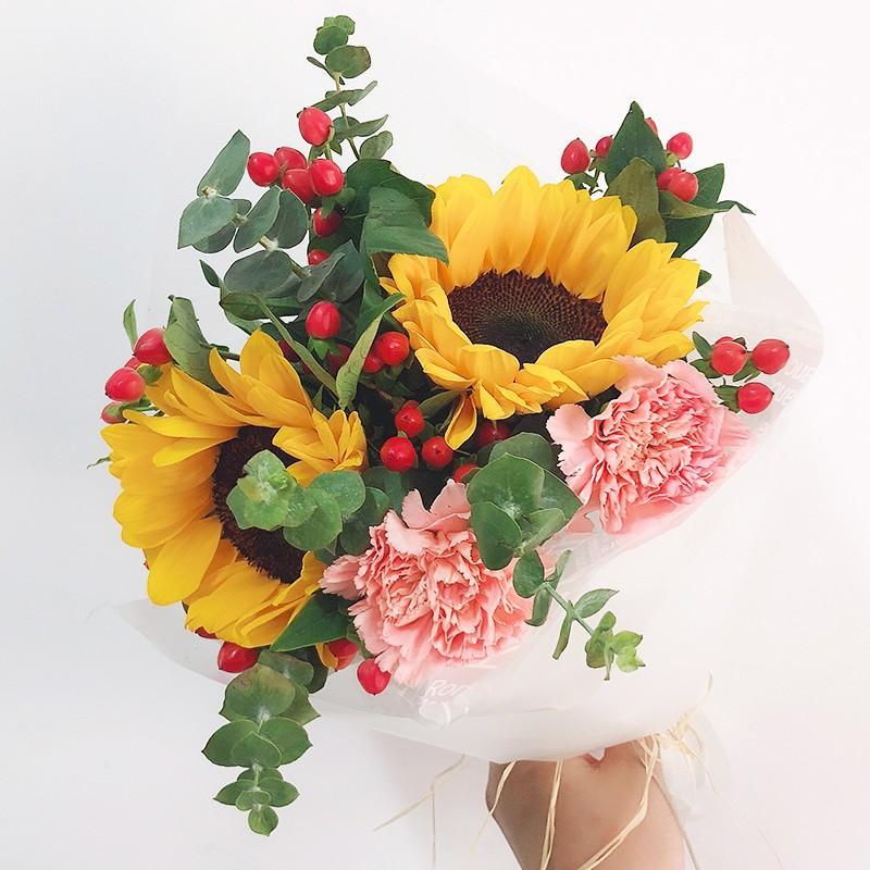 材料:两朵向日葵,两朵红色康乃馨或粉色。搭配尤加利叶、红豆丰满间插。