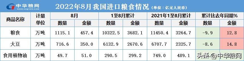 从今年的进口情况来看,我国粮食进口整体呈现量减价扬,进口金额增加四分之一。前8个月,我国进口粮食10322.5万吨,同比减少9.9%,进口金额3682.1亿元,进口均价每吨3567.1元,同比增长25.1%;大豆进口减少574.8万吨,进口均价每吨4354.5元,同比上涨25.6%。
