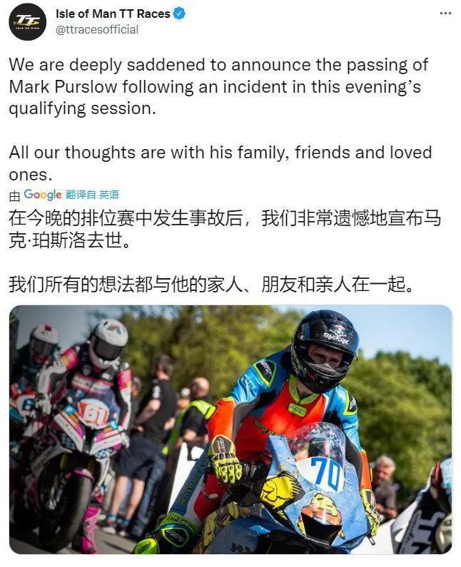 据Isle of Man TT Races曼岛TT摩托车赛官方宣布,一名车手在比赛事故中不幸去世:“我们非常遗憾的宣布马克·珀斯洛在今晚发生的排位赛事故中去世。我们将与他的家人、朋友和所有喜爱他的人同在。”