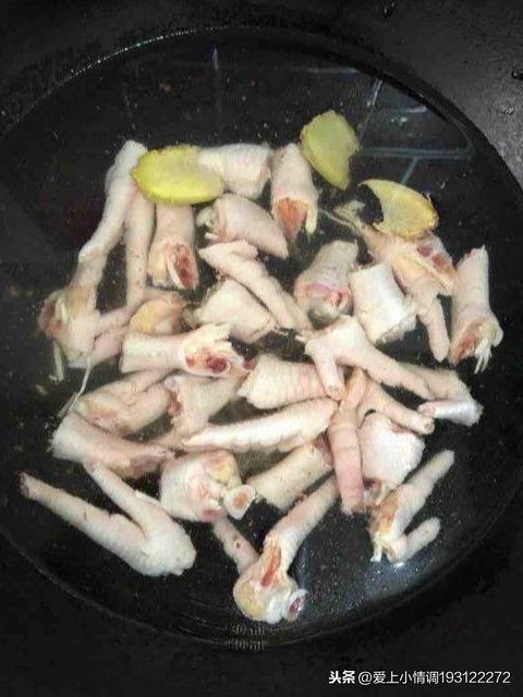 冷水下锅,倒入鸡爪,姜片,适量料酒,煮10分钟左右,捞出洗净,放入碗中备用。