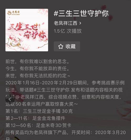 作为话题发起方的的老凤祥也给大家准备了包括重达30克的三生三世足金手镯等众多豪礼,激发了粉丝的强烈创作动力。