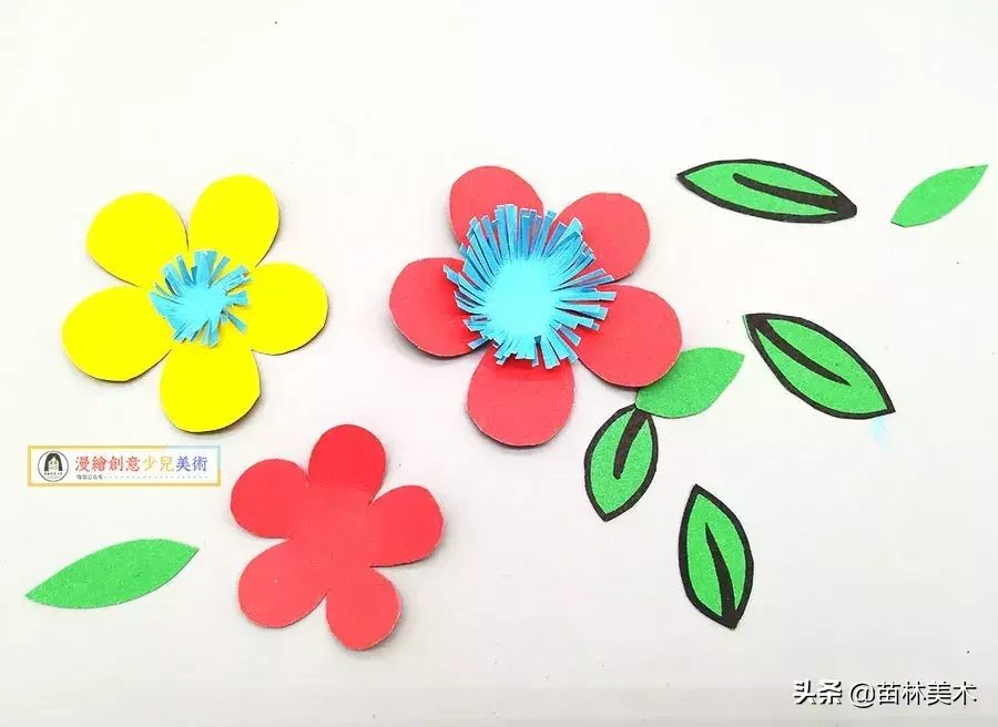 ▲第六步、用彩色的卡纸,剪一些花朵叶子。注意大小的变化。