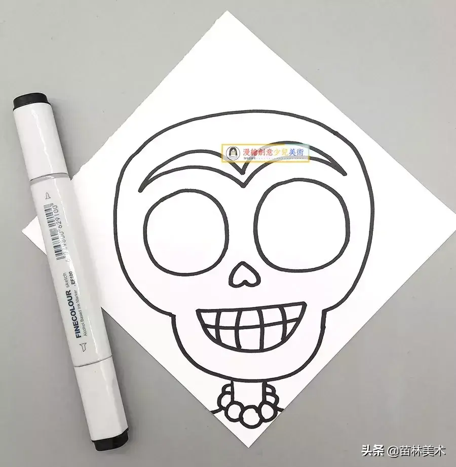 ▲第一步、用记号笔或者黑色马克笔粗头,画出骷髅头的造型。