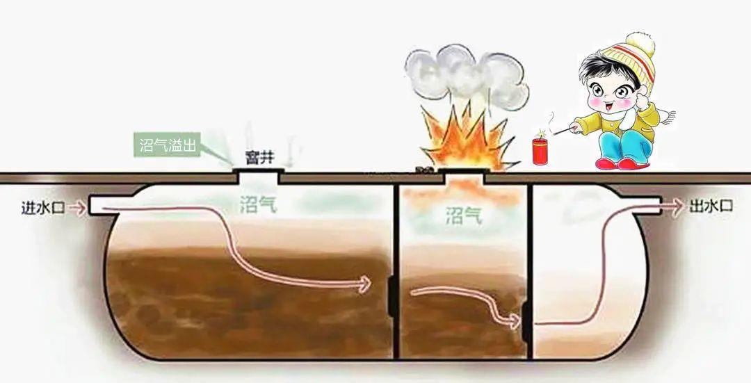 化粪池其实就是一个封闭的容器,其中便便分解会用到沉淀和厌氧发酵的原理。不过与此同时,在这一过程中会产生沼气、二氧化碳以及硫化氢等消化气,而且里面的气压也比外界要高得多。这也造就了,如果是遇到火苗或者烟头,当里面沼气等可燃气体达到一定浓度,就会一触即发,在高压环境下造成燃爆。