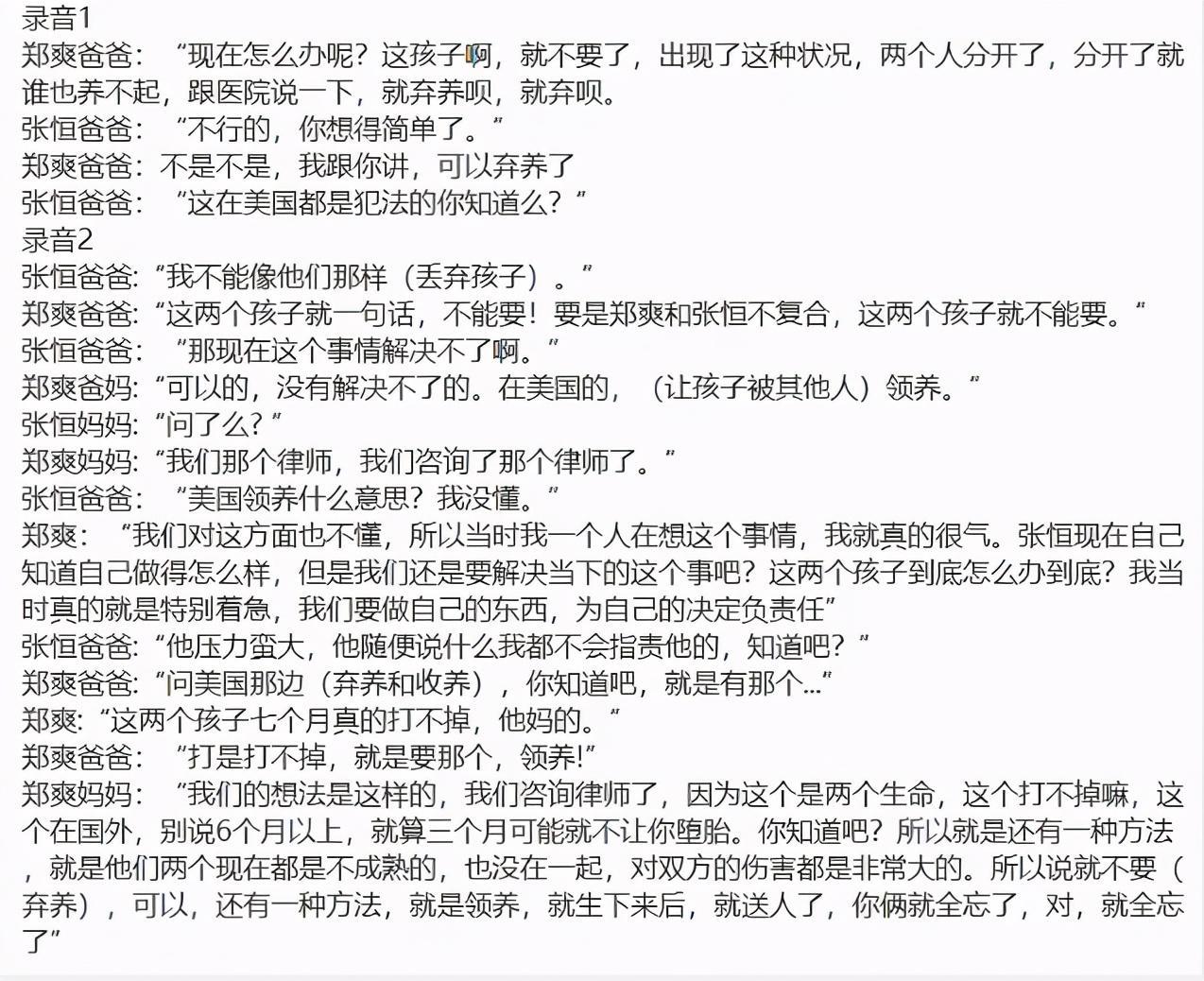 然后就是美国代孕的事情,虽然我们不知道张恒和郑爽谁是这件事情的始作俑者,但是从细节中我们可以看出,郑爽对生孩子这个事情并没有太过于认真的态度,所以她才会选择代孕,而且在代孕的过程中当发现张恒有出轨的嫌疑之后,郑爽竟然无知的想选择终止妊娠。并且在两个孩子出生之后,郑爽竟然想要抛弃孩子。