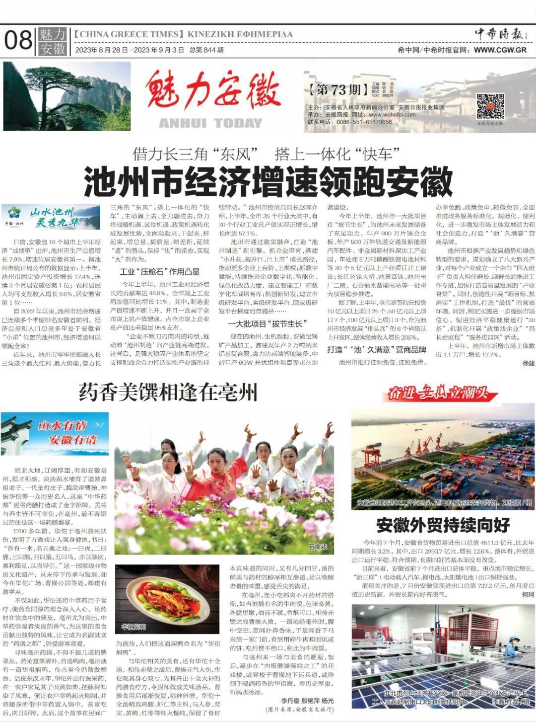 希腊《中希时报》聚焦安徽池州:经济增速领跑全省