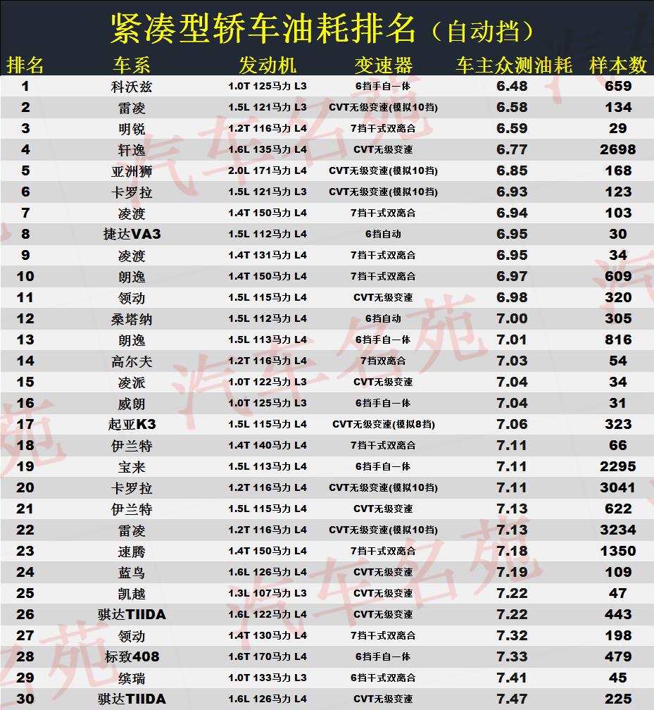 轿车油耗排行榜正式更新:1-85名,轩逸夺冠,朗逸第4,逸动上榜
