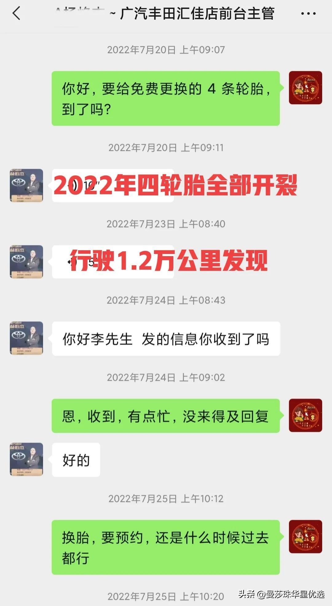 第一次开裂结果:最后4S免工时费给更换4条新轮胎。