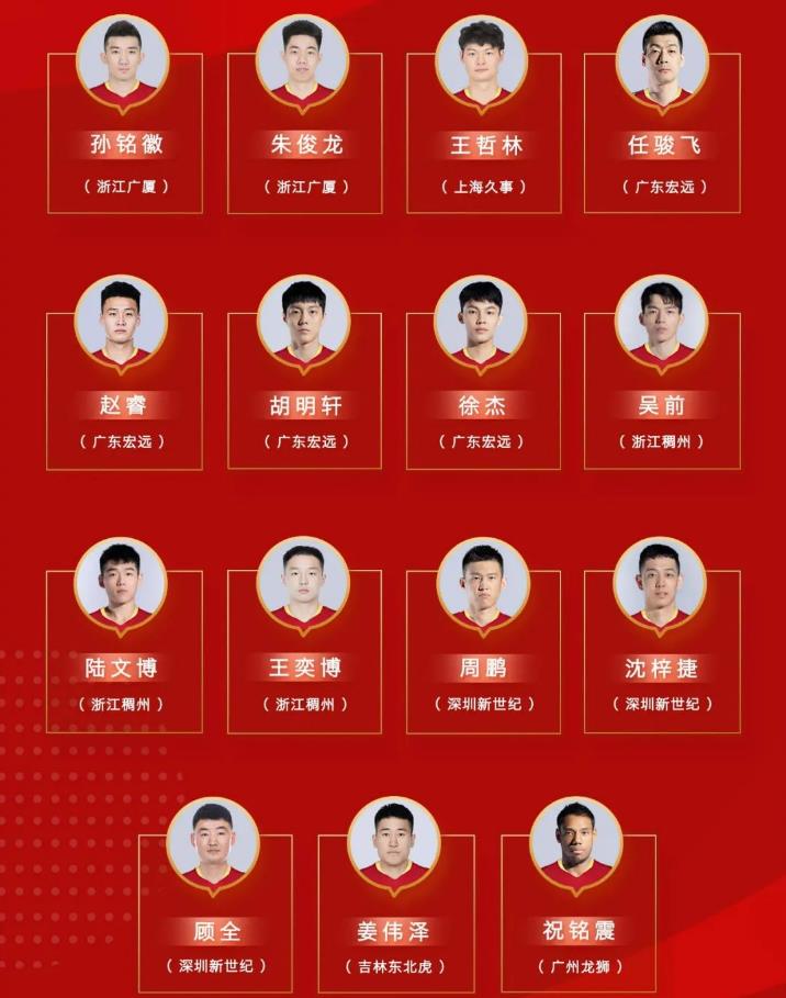 17人分别是:广厦队的孙铭徽、朱俊龙,上海队的王哲林,广东队的任骏飞、赵睿、胡明轩、徐杰,浙江队的吴前、陆文博、王奕博,深圳队的周鹏、沈梓捷、顾全,吉林队的姜伟泽,广州队的祝铭震、新疆队的阿不都沙拉木和在海外打球的周琦。