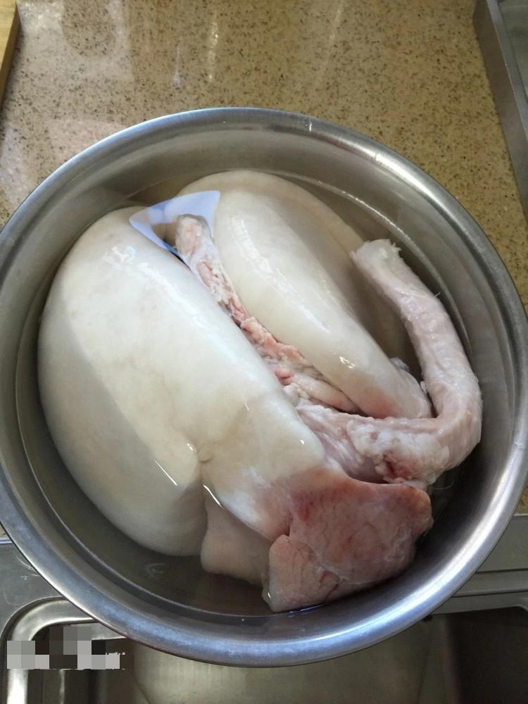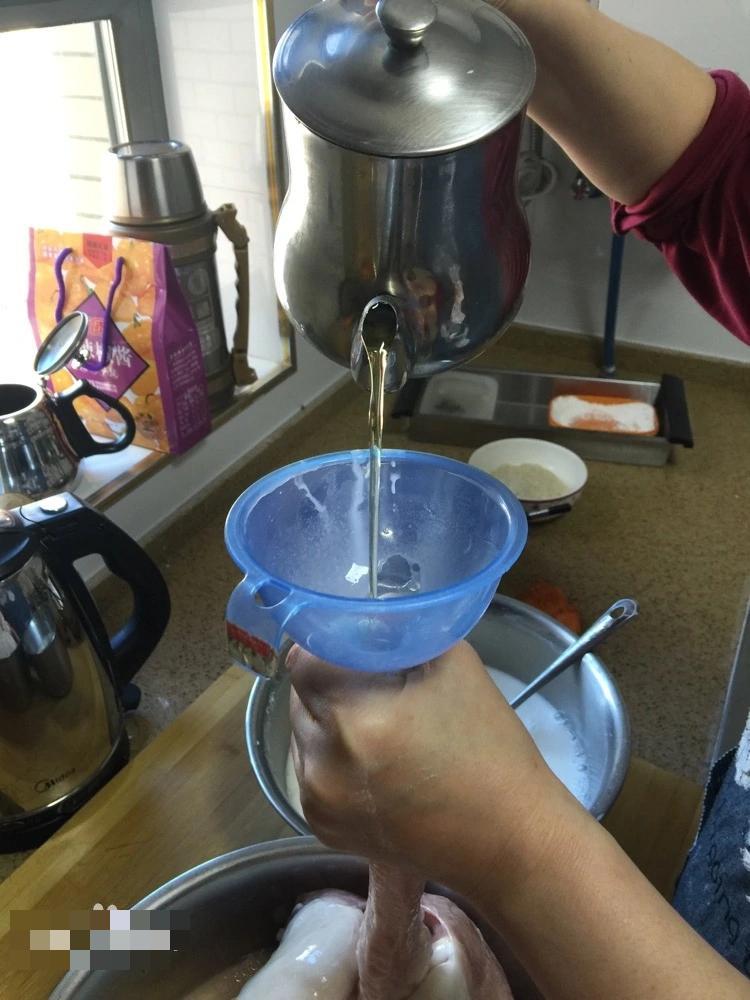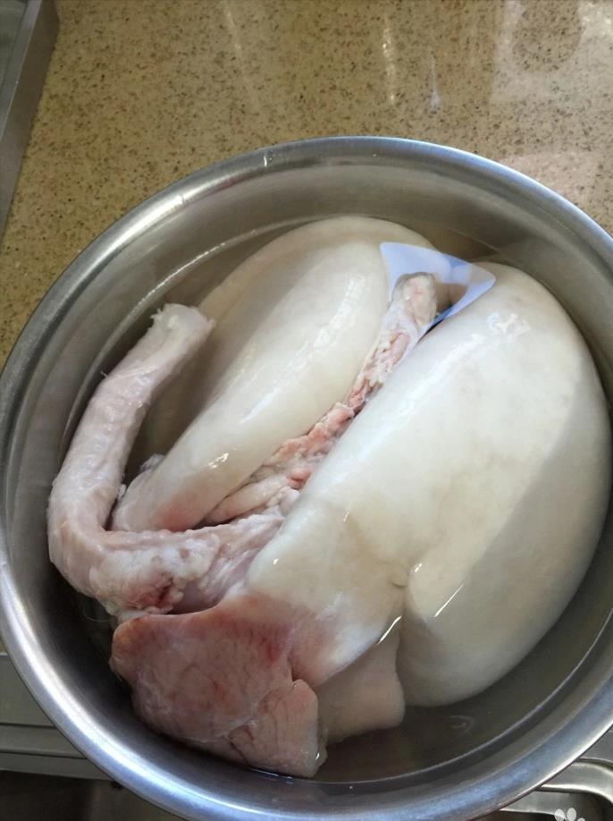 2.上白面粉和好,用清水洗出面筋。待面水沉淀后,撇去大部清水,留适量清水搅动调成面浆。用勺分多次舀出倒入小肚,再用手将面浆慢慢挤入肺叶里。灌到一定程度后,两肺叶中间联心处的一个小管滴清水,再继续灌,将面浆灌完,再灌入用清油、盐、孜然粉调成的水汁。然后将小肚取掉,用绳扎紧气管,封口。放入开水锅煮两个小时左右即熟。入锅中与肺同煮。