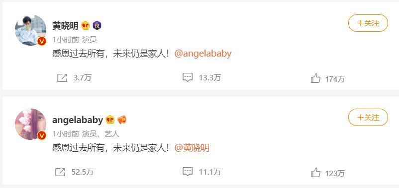 黄晓明和Angelabab从2015年结婚至今7年育有1子,离婚传言不断,如今两人婚姻关系画下句点,但仍维持家人身分。今天2人同步透过微博宣布离婚,双方都表示,“感恩过去所有,未来仍是家人!”