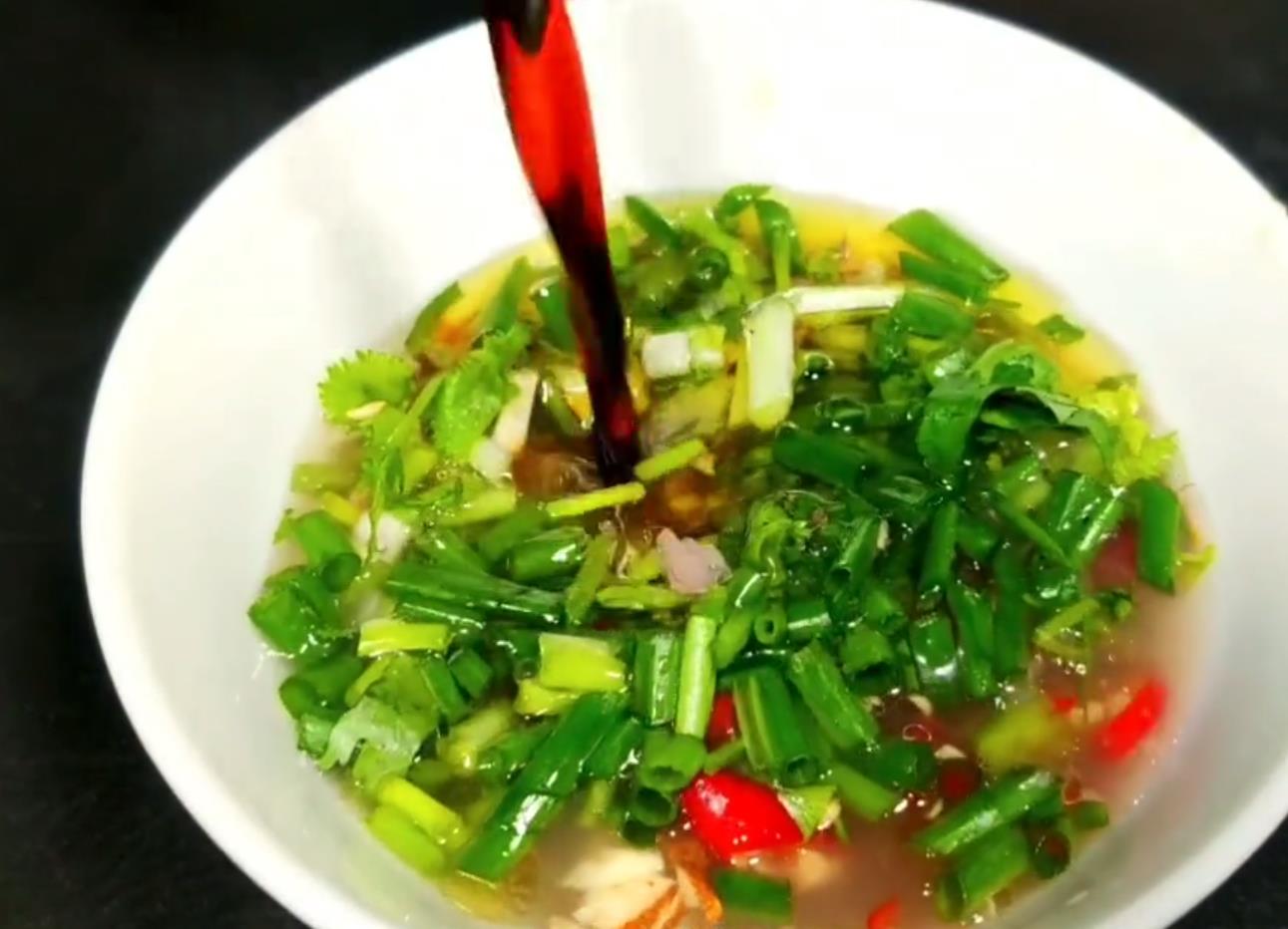 5,调至一个蘸料:小碗中加入蒜末,姜末,香葱,小米辣,香菜,加入蒸鸡时留下的鸡汁,在加入一点生抽即可