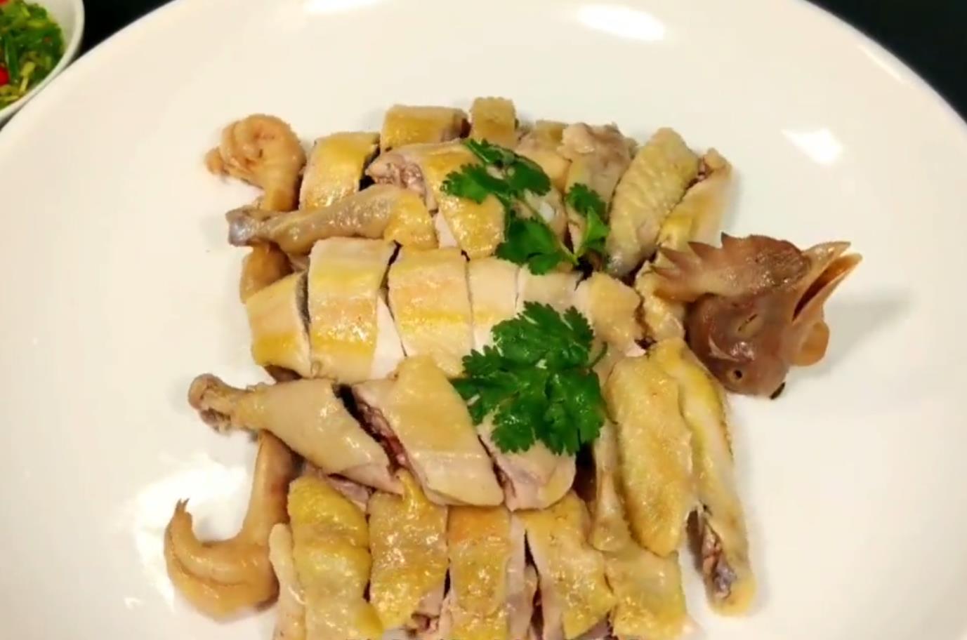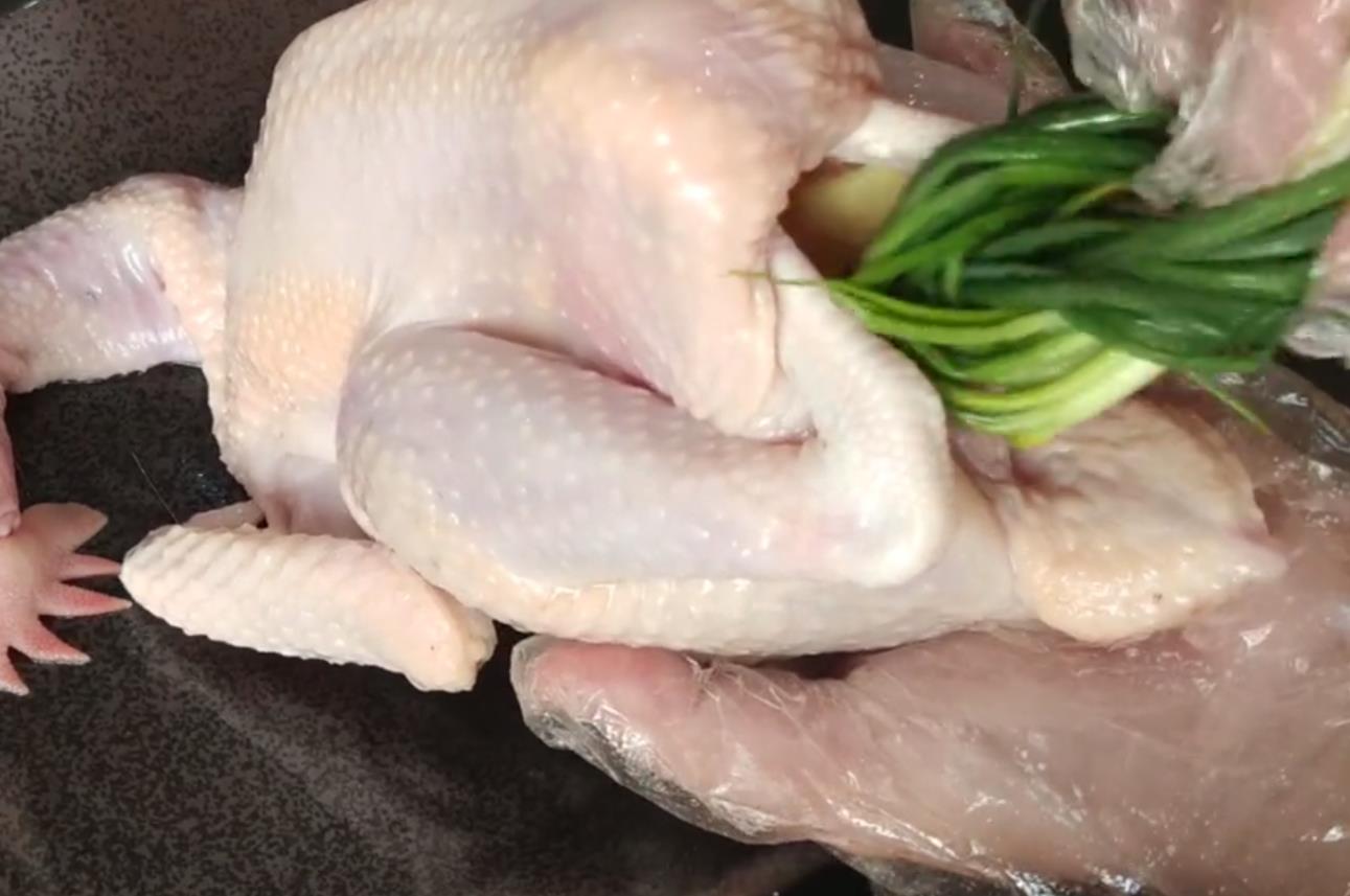 6,鸡蒸好后出锅晾凉,先斩下鸡头,在在斩下鸡翅,鸡腿,鸡爪,抛开腹部,取出葱姜,将鸡一分为二