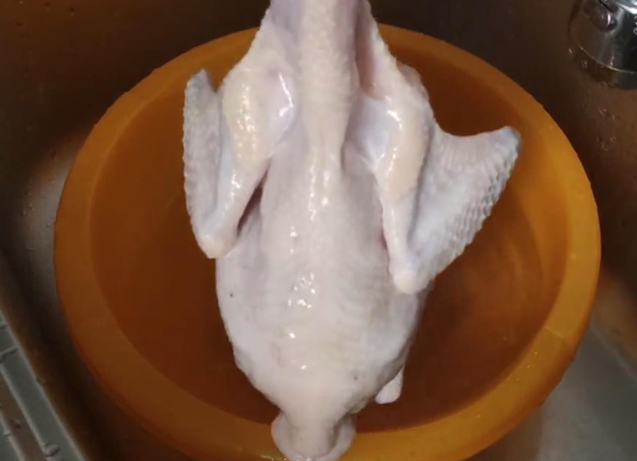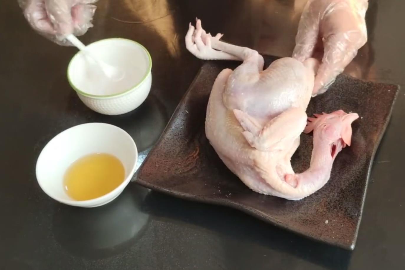1,准备好一只鸡,清洗干净后,加入一勺面粉,用手在鸡的身上不断的揉搓变粘稠后用流水清洗赶紧