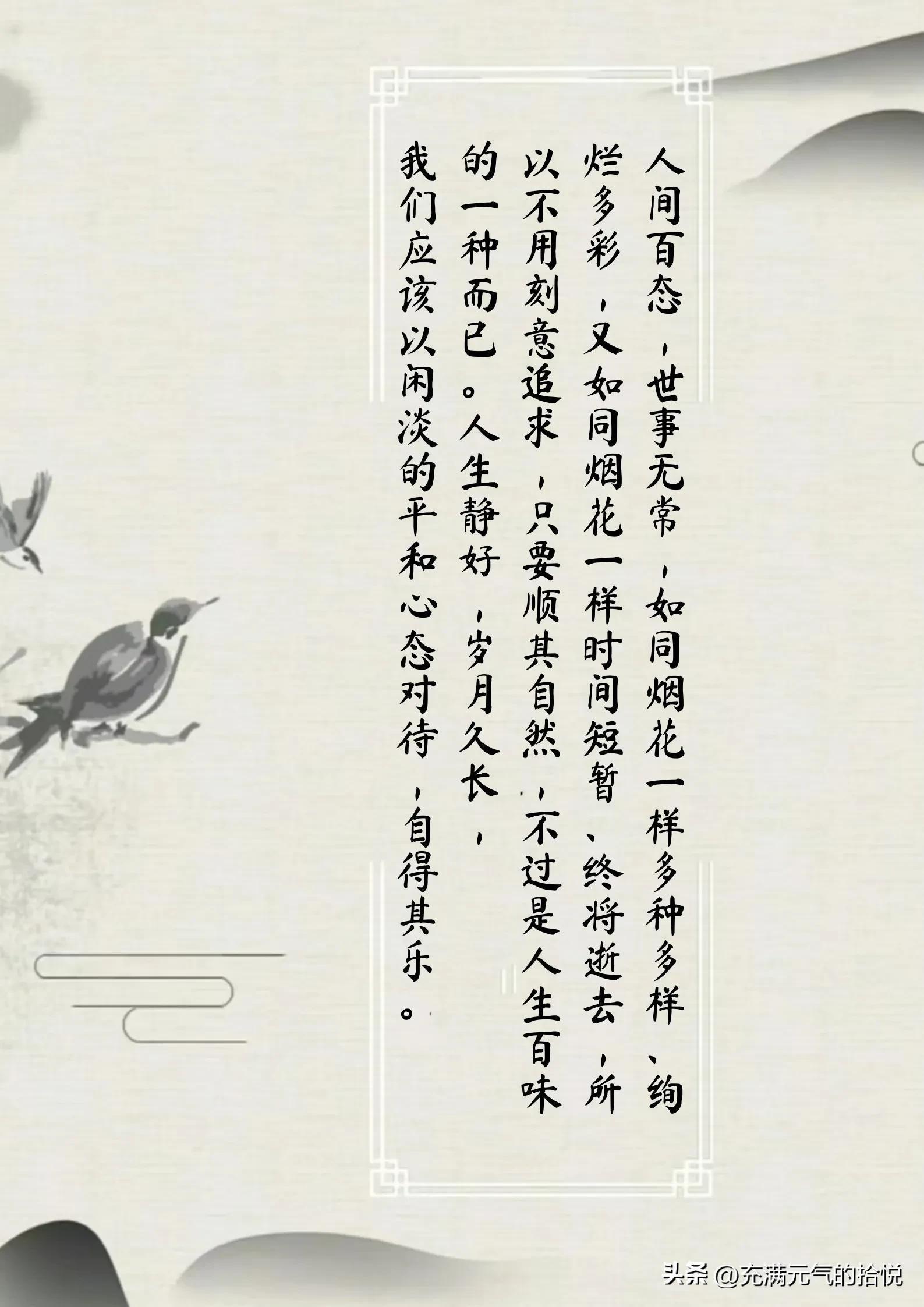 人间百态,世事无常,如同烟花一样多种多样、绚烂多彩,又如同烟花一样时间短暂、终将逝去,所以不用刻意追求,只要顺其自然,不过是人生百味的一种而已。人生静好,岁月久长,我们应该以闲淡的平和心态对待,自得其乐。