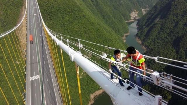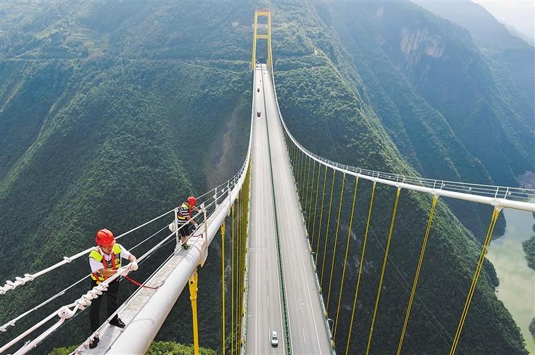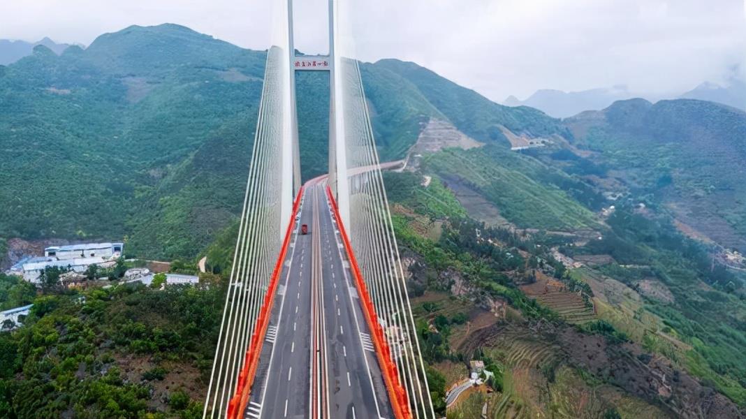 先导索铺设好后两座百米高的塔桥被固定在峡谷两岸,两根主缆与桥体分别包含着127根直径为5.1毫米的特质钢丝,整座桥梁就这样被16129根钢丝悬挂在百米的高空中,这座桥开创了世界的先例,它曾被誉为世界第一高悬索桥,直至2016年贵州盘江大桥建成,第一高桥的名号才被取代,但这也说明我国建桥技术的精进。