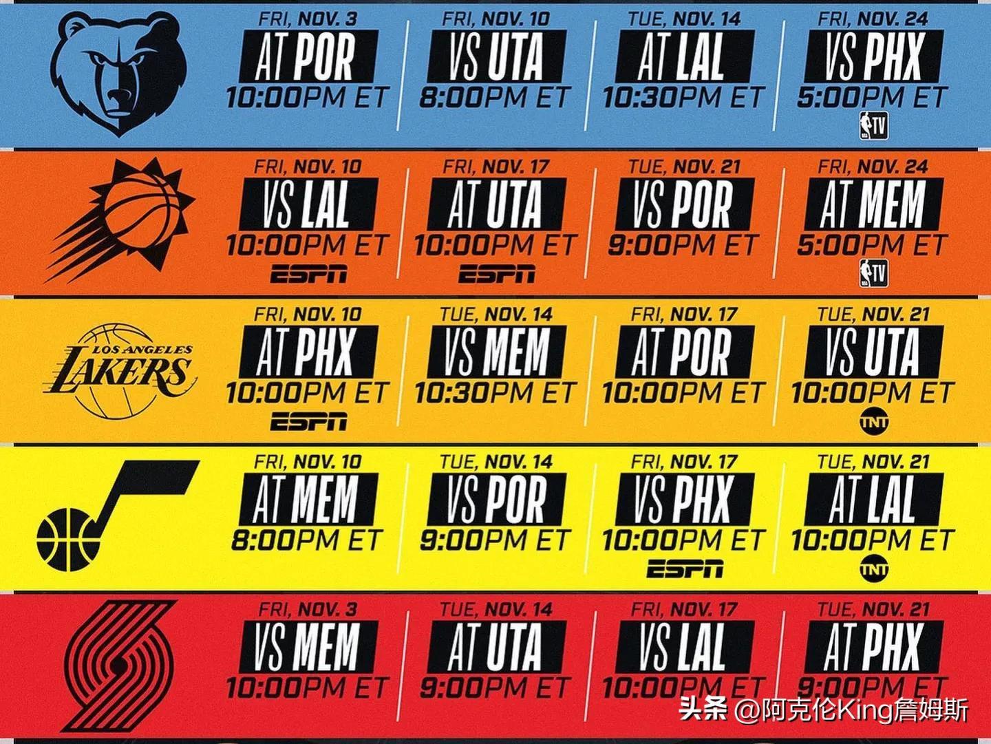 NBA季中锦标赛赛程公布,湖人与灰熊、太阳、爵士、开拓者分在西部A组。在赛程中,湖人队将在不同时间和地点与不同对手展开激烈角逐。