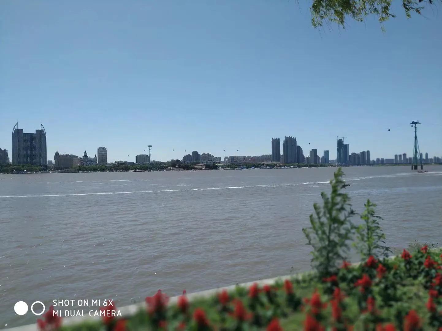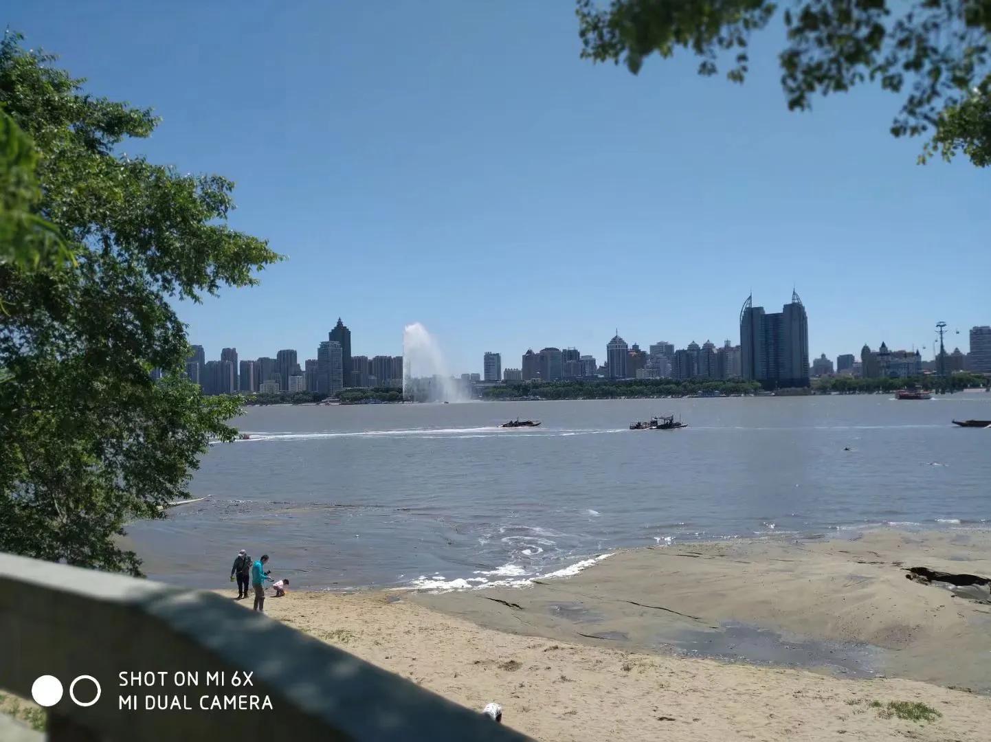 走过中央大街防洪纪念塔,来到码头坐游轮过松花江,观赏着两岸美丽的风景,蔚蓝的天空白云朵朵,江面波光粼粼,远处江桥若隐若现。