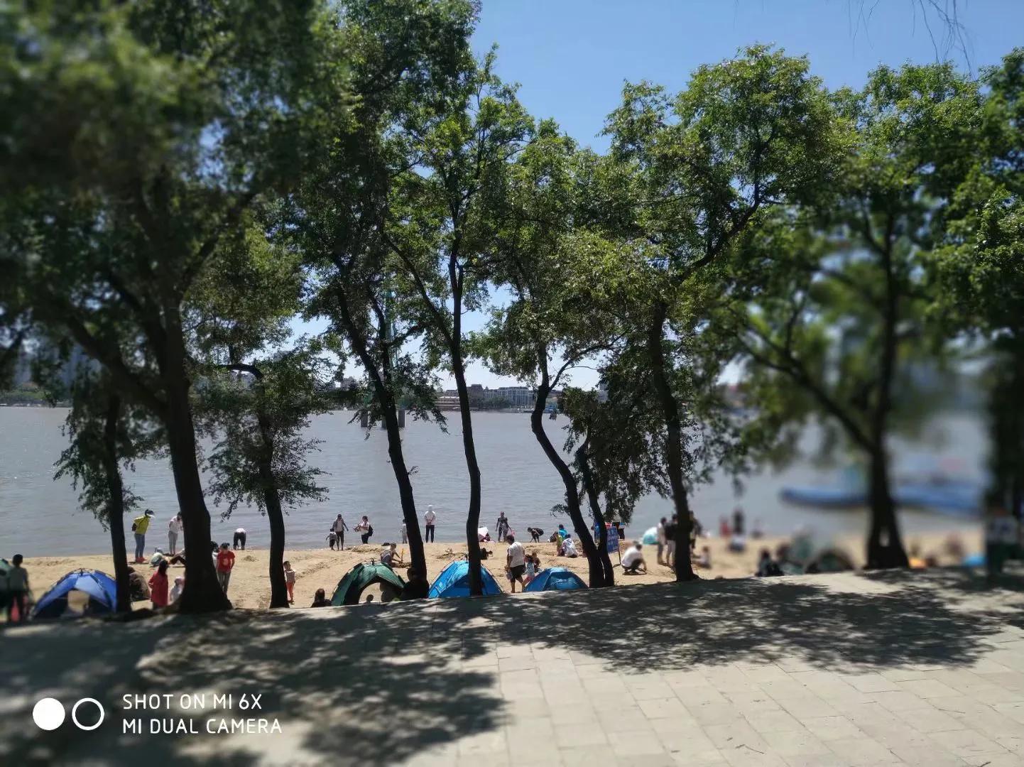 来到了江北,温暖的沙滩上是游人的帐篷和游泳晒太阳的大人孩子。再往前走就到了太阳岛公园。这里有用各种颜色草种出的风景动物,人们流连忘返不停的在拍照,前边有小桥流水瀑布大家拿着自拍杆照个不停,再往前走有一片草地围栏里边有小鹿,引来孩子们围观。