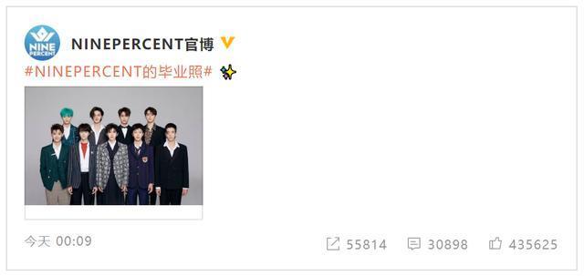 10月6号,Nine Percent的官微正式宣布,成团18个月的组合正式解散!同时晒出了九人最后一次的官方合影“毕业照”。