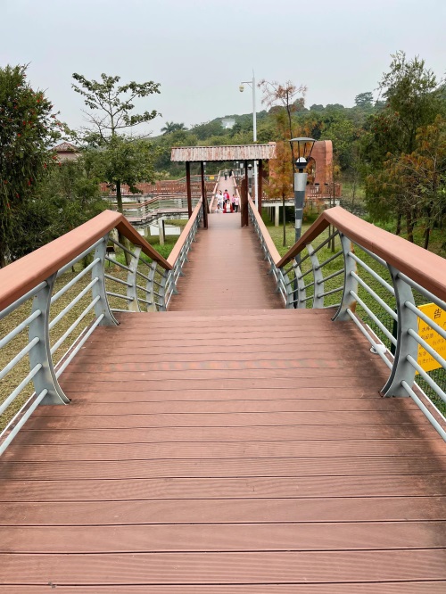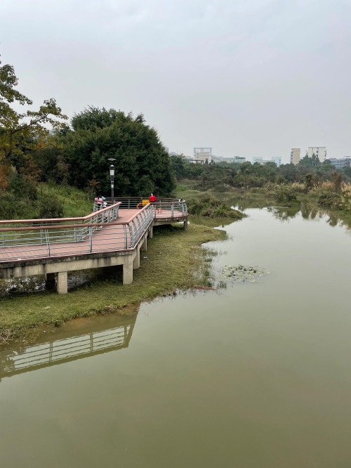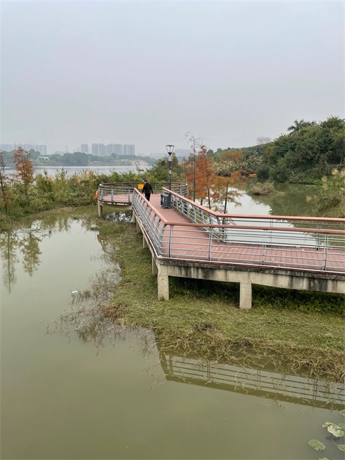 公园木质栈道遍步,但可以休息的凳子却无,这点需要改进的地方