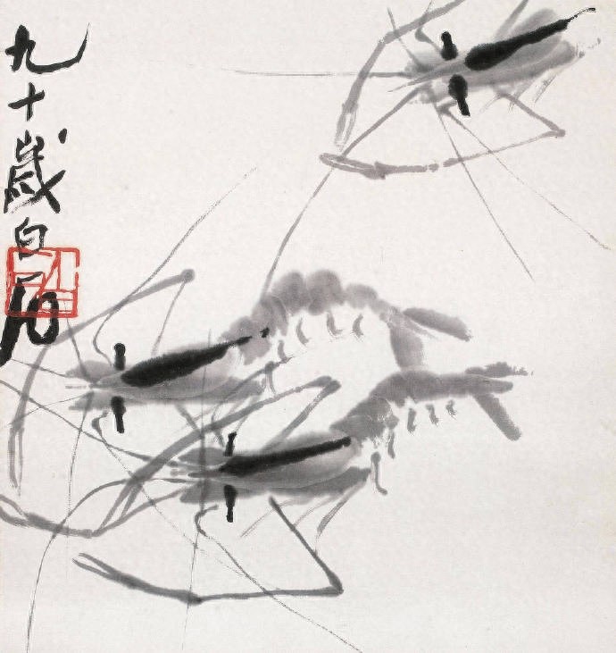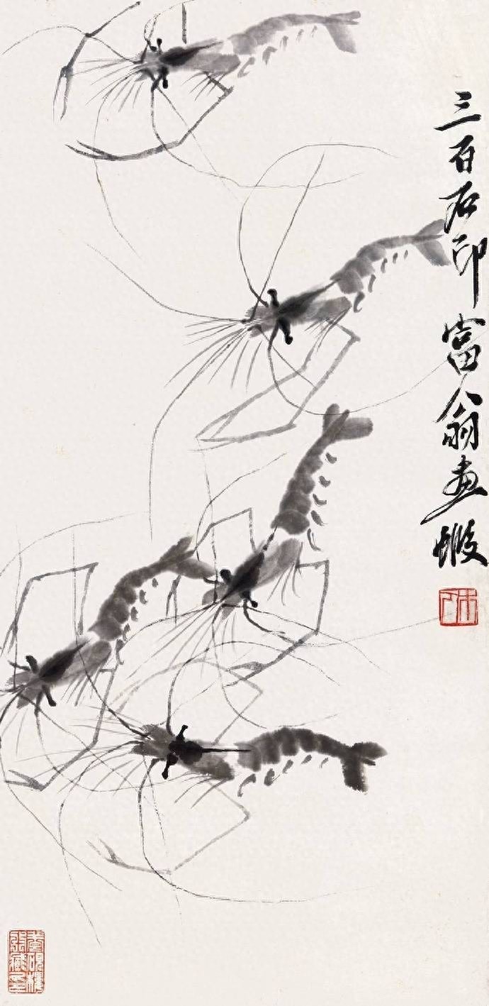 齐白石从小生活在水塘边,常钓虾玩;青年时开始画虾;他曾临摹过徐渭、李复堂等明清画家画的虾;到63岁时齐白石画虾已很相似,但还不够“活”,便在碗里养了几只长臂虾,置于画案,每日观察,画虾之法也因此而变,虾成为齐白石代表性的艺术符合之一。