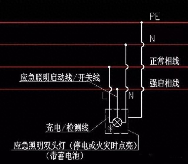 这是典型的双头灯接法,双头灯的特点是:平时不亮,停电或者火灾时点亮。 停电时应急双头灯具的启动。当停电时,充电检测线失电,继电器线圈失电,磁通为0,常闭触点闭合,将电池和应急灯具接通,灯具点亮。