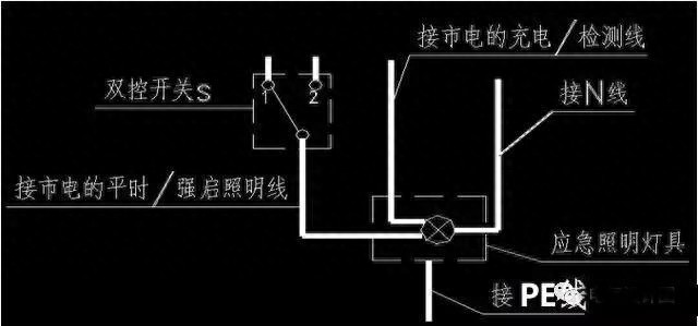 充电/检测线一端接市电,另一端接应急灯具的自带电池。顾名思义,这根线有双重作用,在市电保持有电的状态下,此线用作给应急灯具的自带电池充电,在市电失电的情况下,通过检测线,将市电的零压信号传送给自带电池,由自带电池供电给应急灯具,从而应急灯具点亮,达到启动应急灯具的作用。这是应急灯具在充电/检测线失电后自带电池供电的强启方式。为保证给应急灯具的自带电池充电,这根线一般情况下都是接通的,即有电状态。