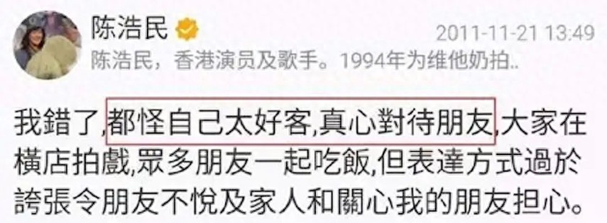 事情发生后,陈浩民先后发了两条微博,第一条微博未提及陈嘉桓的名字,只说自己是太好客了,并没有带眼看人,似有所指。