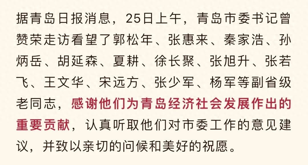 2024年元旦前,新任青岛市委书记曾赞荣看望老干部,郭松年再次出现在青岛人的视线。