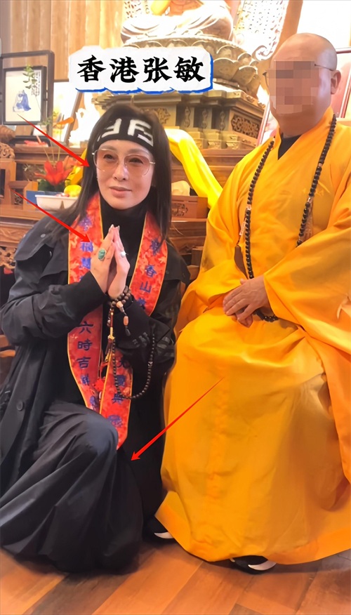 照片里的她半跪在法师身旁,她双手合十,手腕上还戴着一串疑似是佛珠的链子,看起来似乎很是信佛。