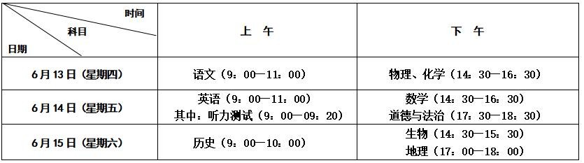 1.各科目分值:语文100分;数学100分;英语100分(含听力测试20分);物理60分;化学50分;道德与法治60分;历史50分;物理、化学实验操作10分(抽选一科);信息技术20分;体育60分;总分610分。