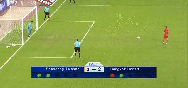 第一轮:泰山队的郑铮率先命中点球,而对手的30号日夫科维奇则放了高射炮。