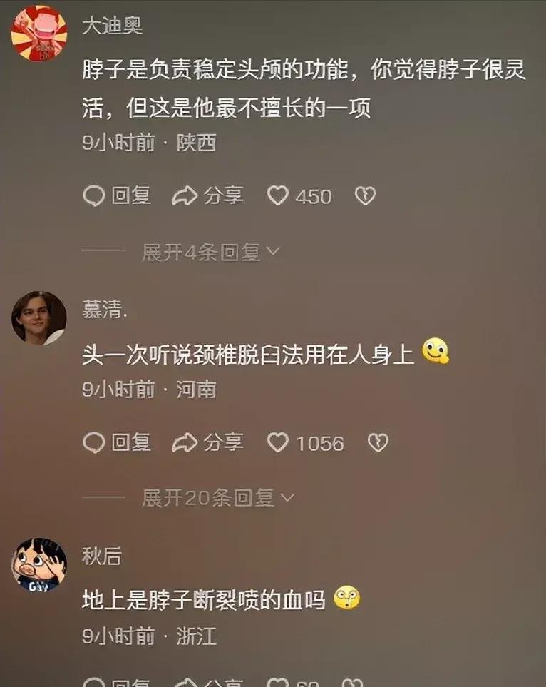 还好奇吗,再好奇就过分了,你对身体的重量真是一无所知,身体的重量可不是一个小小的脖子就可以承受的。