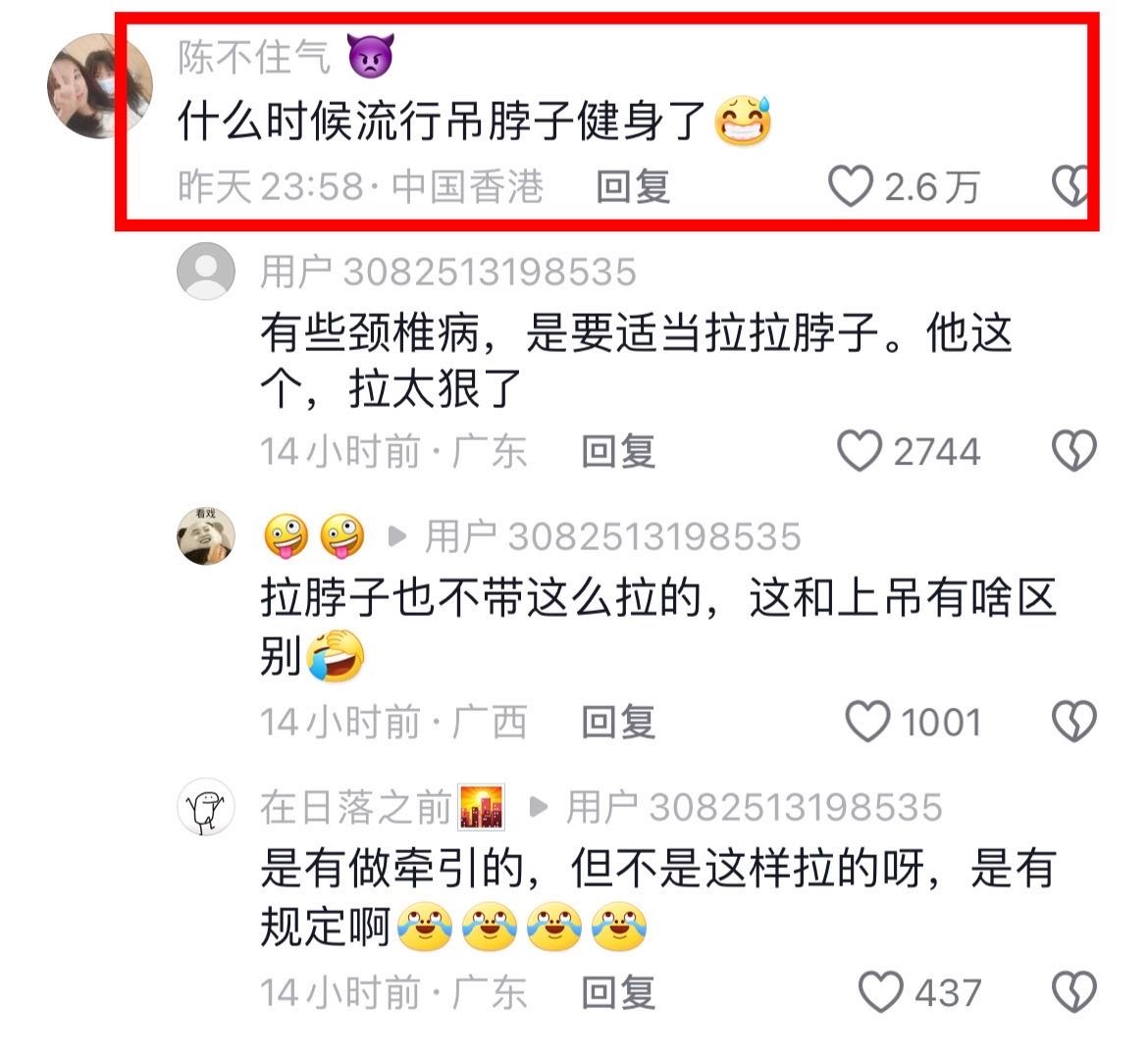 这种“吊脖子”健身方法确实存在很大的风险,尤其是在没有专业指导和保护措施的情况下。脖子是人体非常脆弱的部位,稍有不慎就可能导致窒息或其他严重伤害。尽管这种方法在一些人眼中可能显得有趣或新奇,但其潜在的危险性是不容忽视的。