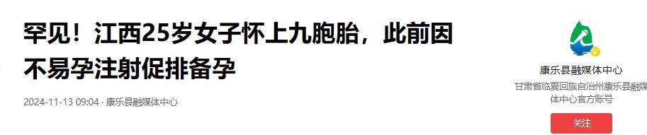 4.康乐县融媒体中心:《罕见!江西25岁女子怀上九胞胎,此前因不易孕注射促排备孕》2024-11-13