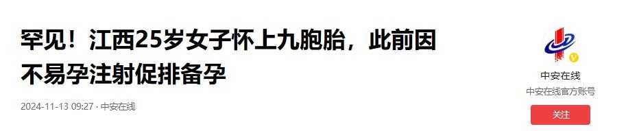 3.中安在线:《罕见!江西25岁女子怀上九胞胎,此前因不易孕注射促排备孕》2024-11-13