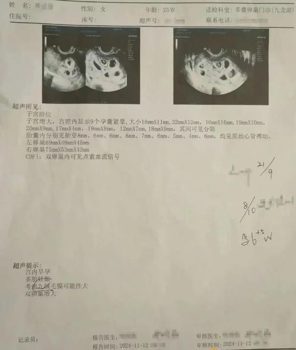 医生称侯女士的子宫里面有8个孕囊,初步断定她怀的是八胞胎,侯女士还没能从这个巨大的冲击中缓过来。