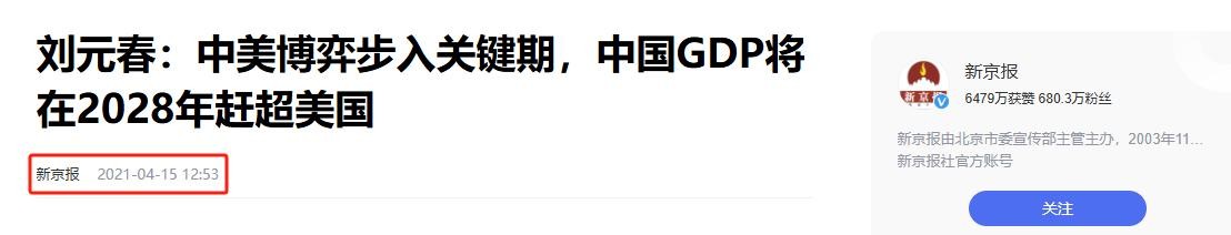 3.原文登载于新京报 2021年04月15日 关于“刘元春:中美博弈步入关键期,中国GDP将在2028年赶超美国”的报道