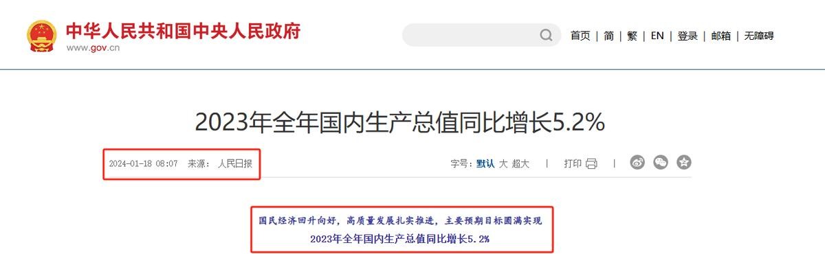 4.原文登载于中国政府网 2024年01月18日 关于“2023年全年国内生产总值同比增长5.2%”的报道