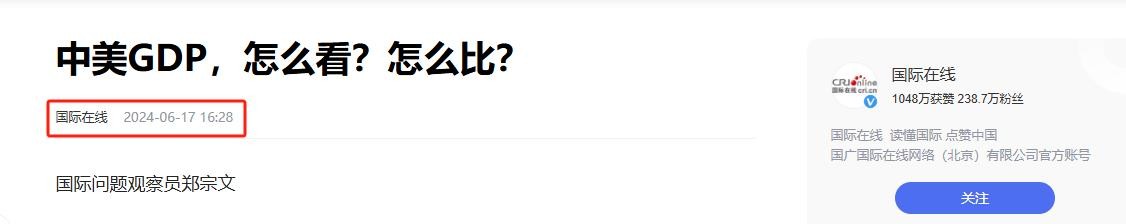 1.原文登载于国际在线 2024年06月17日 关于“中美GDP,怎么看?怎么比?”的报道