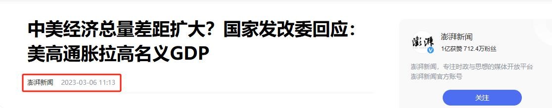 2.原文登载于澎湃新闻 2023年03月06日 关于“中美经济总量差距扩大?国家发改委回应:美高通胀拉高名义GDP”的报道